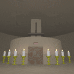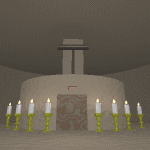 東の塔の中に入りました。 ここのロウソクも人が足を踏み入れると 自動的に火がつくようです。 とりあえず調べてみると、正面の扉の奥が 階段になっています。 扉の上にはプレートが・・・ 調べてみると「1」と書いてます。 1階だから「1」なのでしょうか? まず、階段で上に移動しましょう。 |