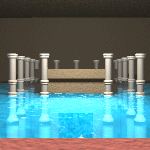 奥にプールがあって小さな神殿が沈んでいます。 このままでは神殿に行けないので、 プールに飛び込んでみるか 周辺を調べるか分岐します。 プールに飛び込んだとしましょう。 自分がかなづちだったことを思い出しますが、 飛び込んでしまったので手遅れです。 でもそこからの分岐を冷静に選んでいくと プールから生還することができます。 |