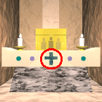 中央部分を5回クリックすると一番前まできます。 祭壇があり、祭壇の上にはロウソクと ロウソク3本描かれた金の箱があります。 祭壇の中央には十字のスイッチと 丸いスイッチが4つあります。 この時点では十字のスイッチを押しても 何もおきません。 また、丸いスイッチを押すとこの部屋から 強制的に出されてしまいます。 |